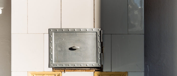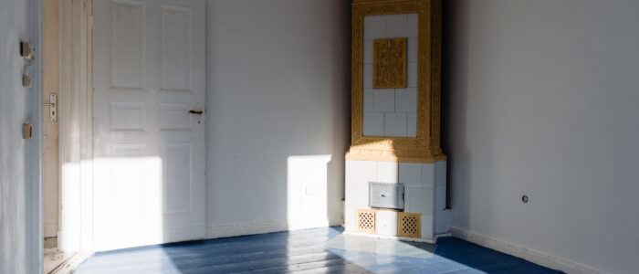 The living room features attractive original wooden floorboards (painted) and still houses the beautiful historic tiled heating oven.