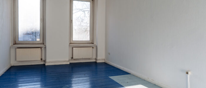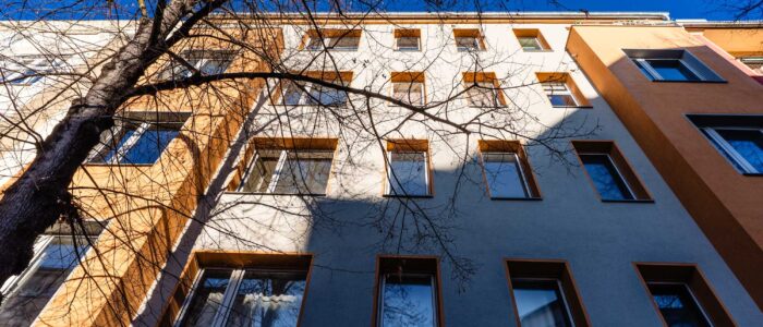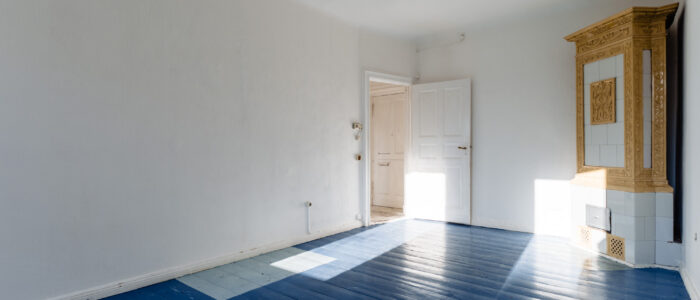 This vacant apartment is located on the second floor of the front building and benefits from an open view through a gap between neighbouring houses, making the space exceptionally bright.