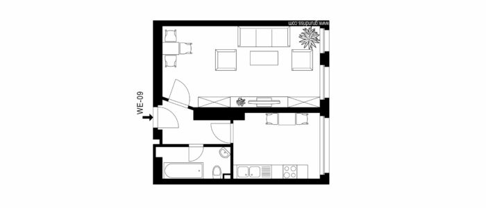 The rooms are generously proportioned: the kitchen comfortably accommodates a dining table, and the bathroom offers space for a bathtub.